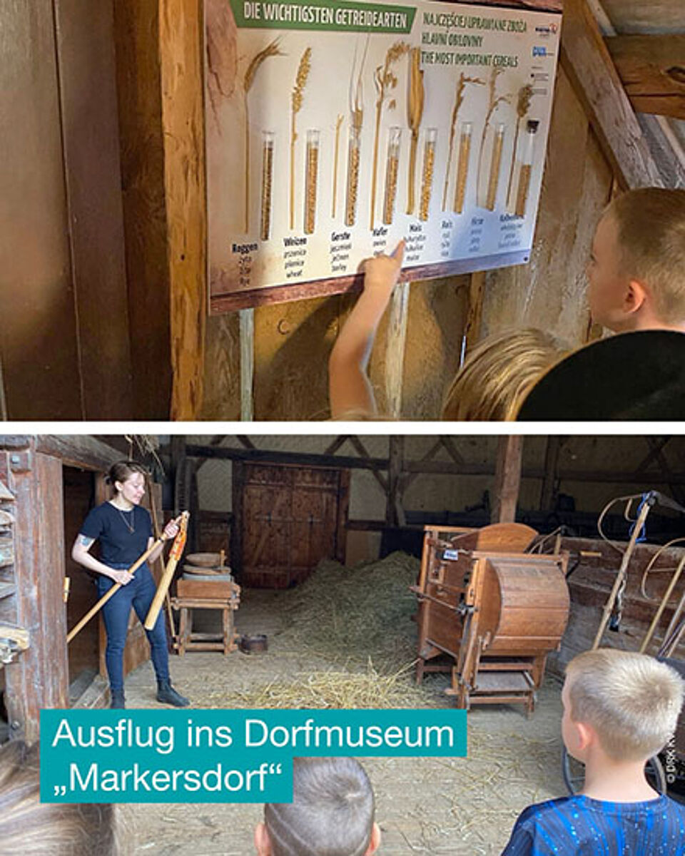 Die Hortkinder aus Reichenbach durften im Dorfmuseum Markersdorf selbst tätig werden - Getreide dreschen und mahlen. Wie entsteht das Brötchen auf dem Frühstückstisch? Welche Zutaten werden dafür benötigt?